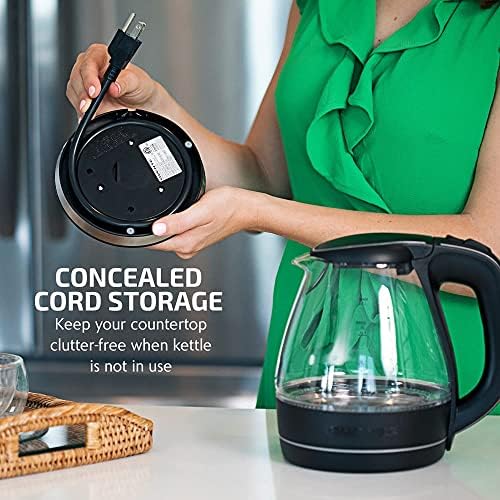 This kettle features a stainless steel concealed heating element to help prevent extra objectionable mineral deposits such as nickel found in your drinking water. It also features a flip-back lid that opens with one touch, and an adjustable opening wide enough to fit your fist for convenient filling and cleaning. For safety purposes, it’s equipped with Automatic Shut-Off upon boiling and Boil-Dry Protection Technology which automatically shuts off the kettle when no water is in the carafe. It also comes with a secure locking lid, LED indicator lights, a washable filter, and a comfortable stay-cool handle and button. It’s also easy to store—its 30 inch cord wraps neatly into its base for a clutter-free space.